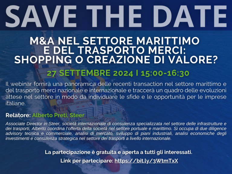 Il prossimo 27 settembre, dalle 15:00 alle 16:30, si terrà il webinar organizzato dal FLC sul tema “M&A nel settore marittimo e del trasporto merci: