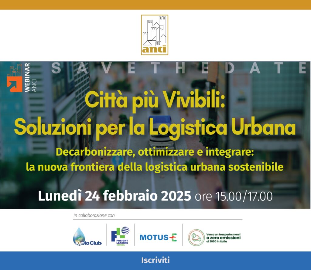 Si terrà lunedì 24 febbraio, dalle 15:00 alle 17:00 online, il webinar organizzato da Anci in collaborazione con FLC, Kyoto Club, Motus-E e ZET Italia dedicato al tema “Città più vivibili: soluzioni per la logistica urbana. Decarbonizzare, ottimizzare e integrare: la nuova frontiera della logistica urbana sostenibile”.