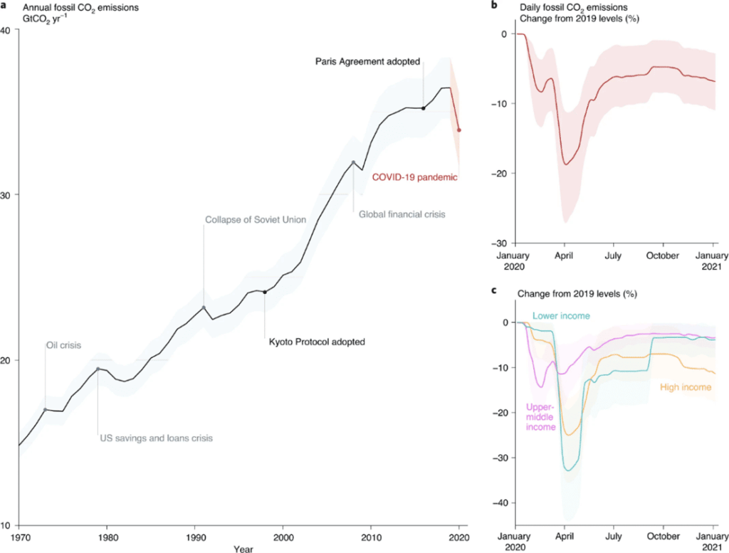 Legenda del grafico: a, Emissioni annuali per il 1970–2019 in GtCO2 yr−1, inclusa una proiezione per il 2020 (in rosso) sulla base dell’analisi del Global Carbon Project1. b, Variazione giornaliera delle emissioni nel 2020 causate dalle restrizioni COVID-19, rispetto a una giornata media nel 2019, aggiornata dalla pubblicazione iniziale a maggio 2020 (rif. 3). c, Come in b ma per tre gruppi di reddito economico: il gruppo di paesi ad alto reddito con obiettivi di emissione ai sensi del protocollo di Kyoto; economie a reddito medio-alto (compresa la Cina) come definite dalla Banca Mondiale; e le economie a reddito medio-basso e le economie a basso reddito (compresa l’India) come un unico gruppo. Le crisi economiche ed energetiche globali sono evidenziate in a, insieme agli episodi chiave della politica internazionale.