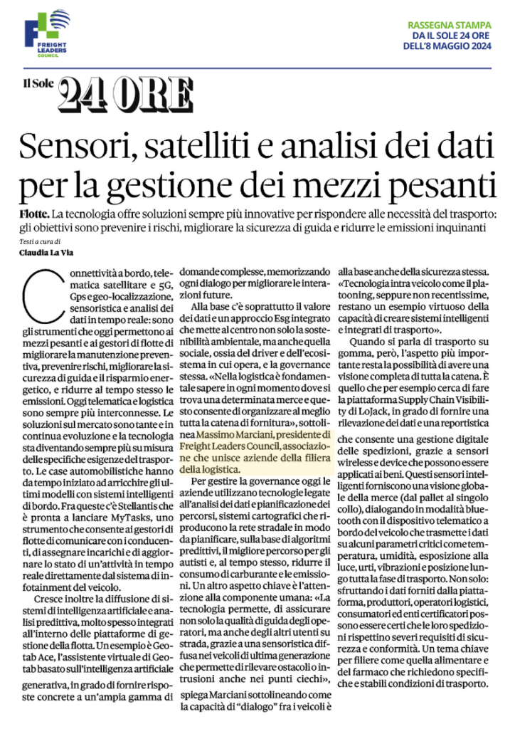 Dal Il Sole 24 Ore di mercoledì 8 maggio: “Sensori, satelliti e analisi dei dati per la gestione dei mezzi pesanti”, parla il presidente FLC, Massimo Marciani.